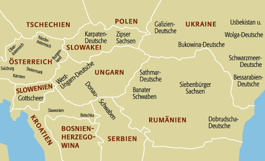 Gebiete: Banat, Batschka, Bessarabien, Buchenland, Branau, Dobrudscha, Galizien, Gottschee, Hauerland, Heideboden, Ofener Bergland, Sathmar, Schomodei, Siebenbürgen, Slawonien, Syrmien, Tolnau, Zips.